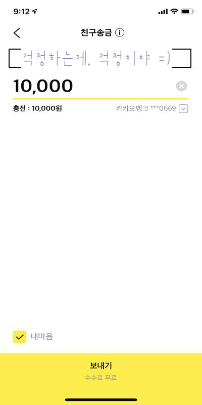 저는 '내마음' 봉투에 담아 테스트로 10,000원을 송금해보았습니다. 테스트라도 큰돈을 송금하면 상대방(신랑)이 돌려주지 않을 것 같아ㅋㅋ 소소하게 10,000원을 보내볼게요.