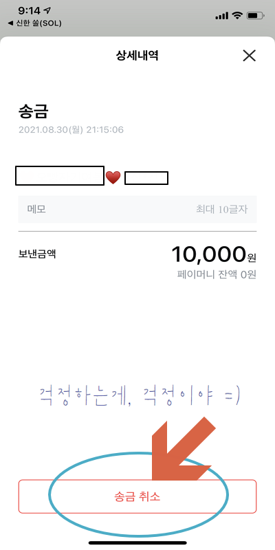 상대방에게 10,000원을 성공적으로 송금했구요, 화면에서 보듯이 바로 송금 취소도 가능하지만 일단 확인을 눌러서 마무리해볼게요.
