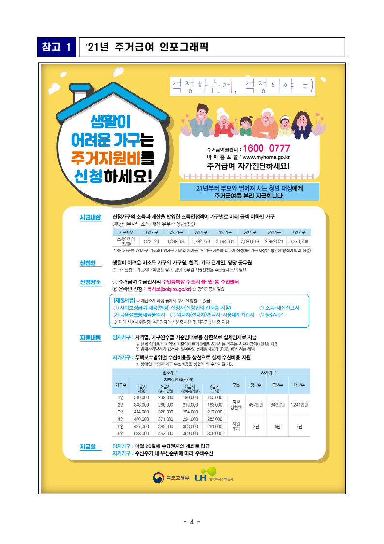 구체적인 대상자 선정 기준, 임차 급여 지원방식 등은 주거급여 콜센터(1600-0777)에서도 상담이 가능하다고 합니다.