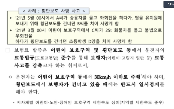 보험료를 할증하는 이유는, 어린이 보호구역 및 횡단보도 등에서 운전자의 교통법규 준수를 통해 보행자(어린이, 고령자, 일반 등) 교통사고를 감축코자 하는 취지라고 합니다. 운전자는 어린이 보호구역 등에서 30km/h 이하로 주행해야 하며, 횡단보도에서 보행자가 건너고 있을 때에는 반드시 일시정지를 해야 합니다.