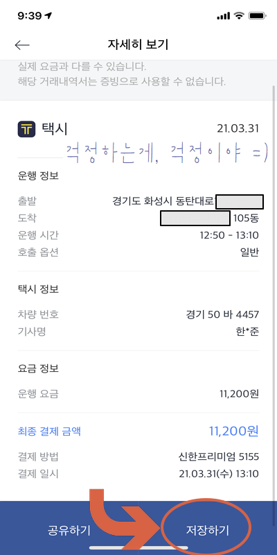 그동안 택시를 탑승하고 결제한 기록들이 쭉 나오더라고요. 우리는 카카오 택시 영수증 발급에 대해 알아보기로 했기 때문에 그나마 가장 최근에 이용했던 택시 기록을 클릭 해주었더니, 위 사진과 같은 창이 뜨더라구요. 카카오택시 영수증 발급을 위해서는 <저장하기>를 눌러주세요.