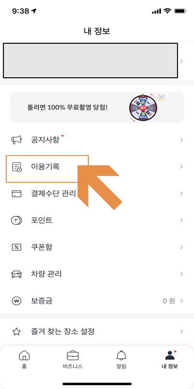내 정보에 들어가면 여러 메뉴 중 이용 기록 메뉴가 있는데요, 이 곳을 누르면 확인 가능합니다.